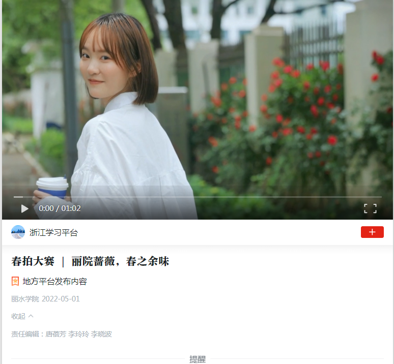 5月1日,学习强国浙江学习平台刊发了我校蔷薇花景观的内容。暮春时节,学校的蔷薇已悄然盛放。雨后的柔光洒在错落的花枝上,映衬着初开的蔷薇和赏花人笑颜,美不胜收。