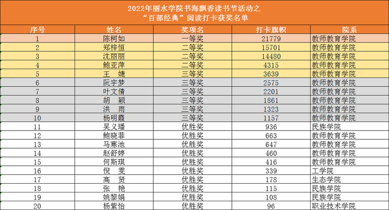 本次活动根据读者的总阅读打卡天数、阅读时间等进行个人综合排名,共有20名同学脱颖而出,获得奖项。其中一等奖1名,二等奖3名,三等奖6名,优胜奖10名。