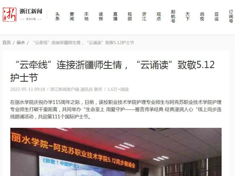 5月11日,浙江新闻客户端发布了我校职业技术学院护理专业师生与阿克苏职业技术学院护理专业师生共同举办5.12线上同步连线朗诵活动的报道。