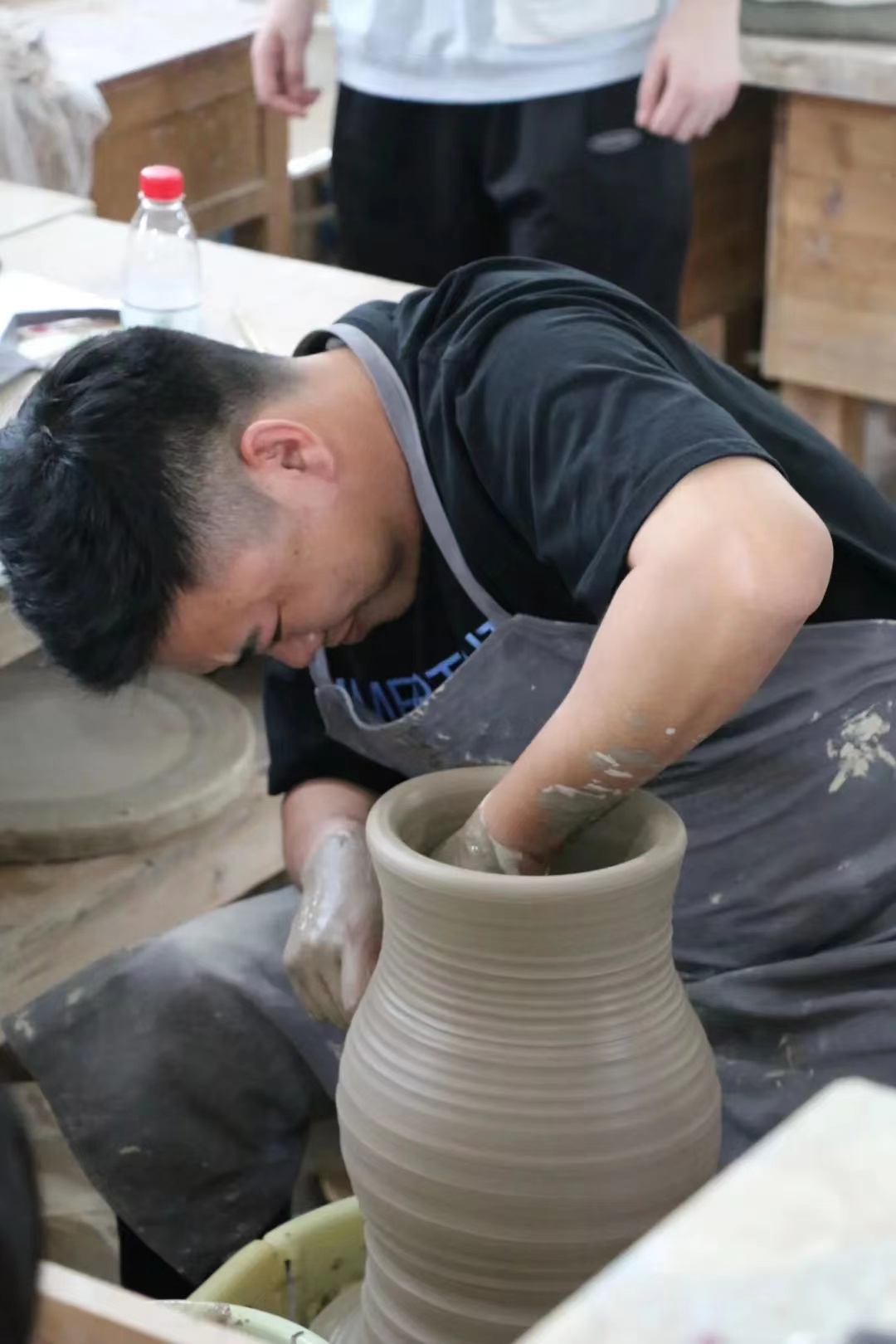 5月11日上午,在陶瓷艺术设计专业实训基地,陶瓷艺术设计19班的胡伟胜同学在青瓷烧制技艺传承人竺聪林的悉心指导下,捧正、开孔、拉直筒、放型,行云流水、一气呵成。一件形式新颖、造型独特的青瓷雏形,完美地呈现在了拉坯机的转台上,这让胡伟胜同学惊喜万分。