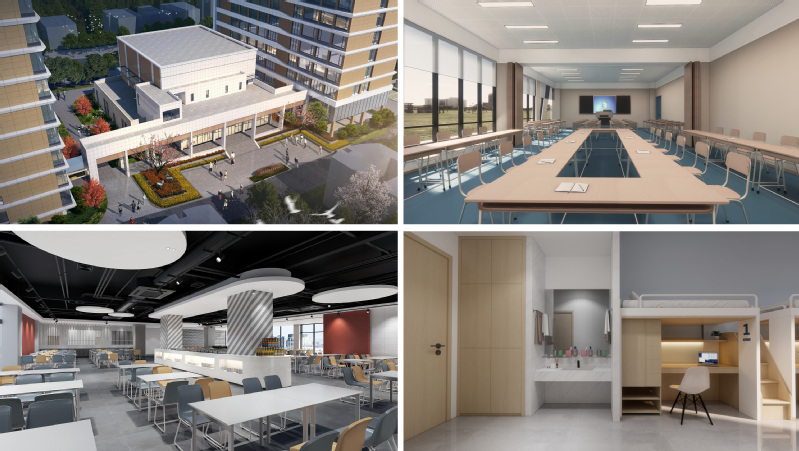 职业技能培训中心大楼为地上10 层,地下1层,建筑高度38.66米。主要设置接待大厅、餐厅、厨房、产学合作空间、教室、教师工作室及144间学员宿舍。学生宿舍楼为地上19层,地下1层,建筑高度70.35米。主要设置非机动车停车位、排烟机房、公共活动空间、门厅、学生配套公共活动室及338间学生宿舍。