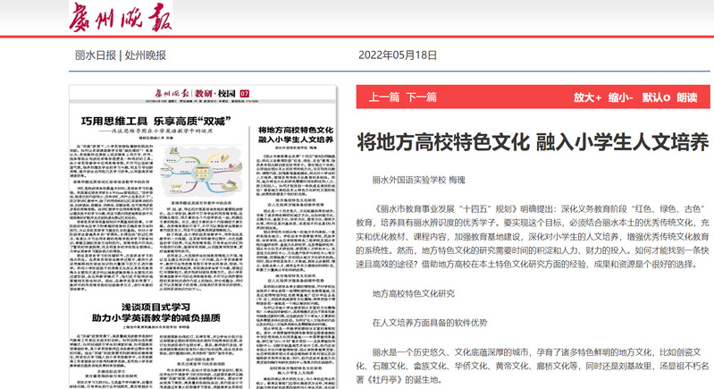 5月19日,处州日报刊发了关于将我校特色文化融入小学生人文培养的内容。
