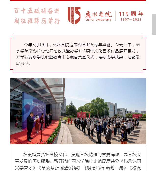 5月18日,丽水日报微信公众号刊发了我校举行庆祝办学115周年校史馆开馆及职教中心奠基活动的消息。