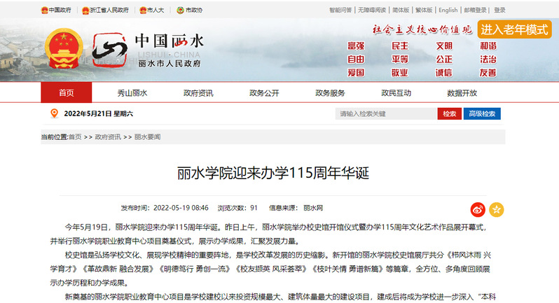 5月19日,丽水市政府网站刊发了我校迎来办学115周年华诞的消息。