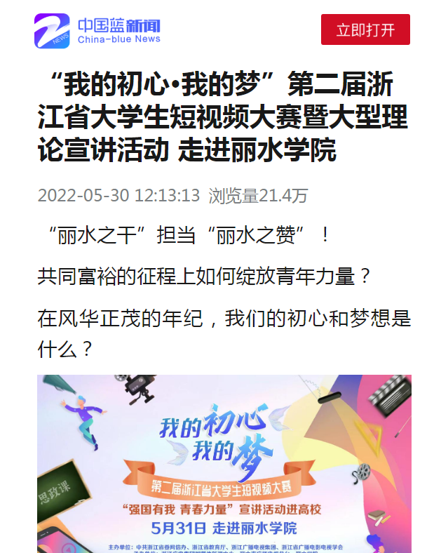 5月30日,浙江广电集团中国蓝新闻APP刊发了我校即将举办“我的初心·我的梦”第二届浙江省大学生短视频大赛暨大型理论宣讲活动的消息。