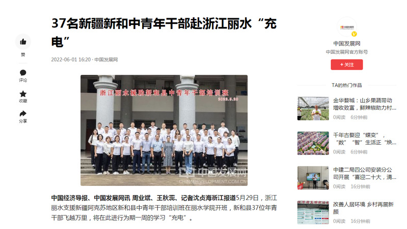 6月1日,中国发展网在今日头条平台刊发了我校举办新疆新和中青年干部培训的消息。