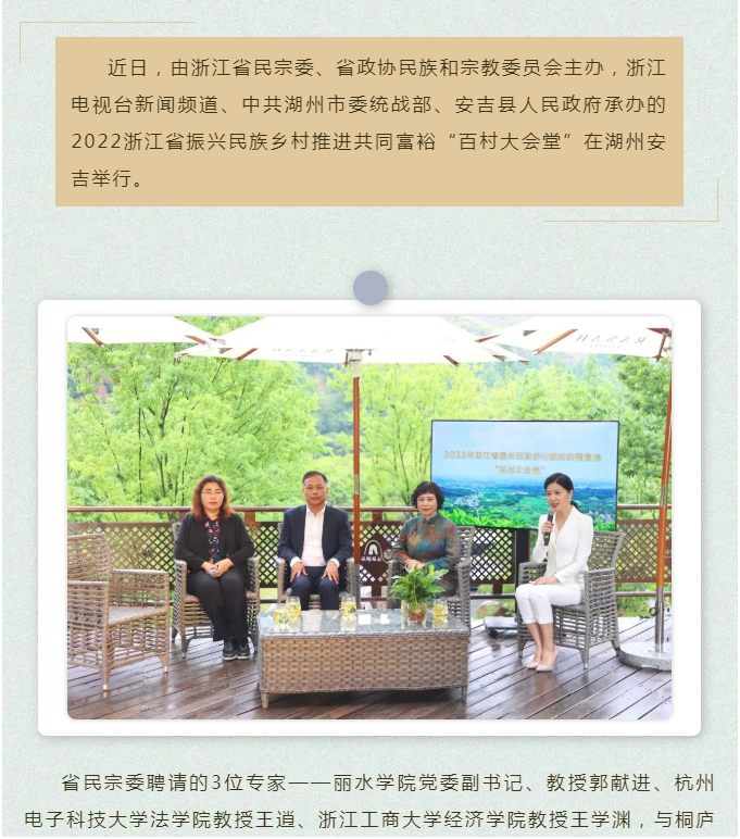 6月2日,浙江民宗委微信公众号刊发了我校党委副书记、省民宗委特聘专家郭献进教授受邀参加2022浙江省振兴民族乡村推进共同富裕“百村大会堂”访谈节目的消息。