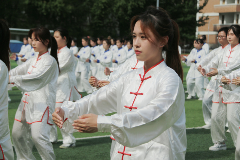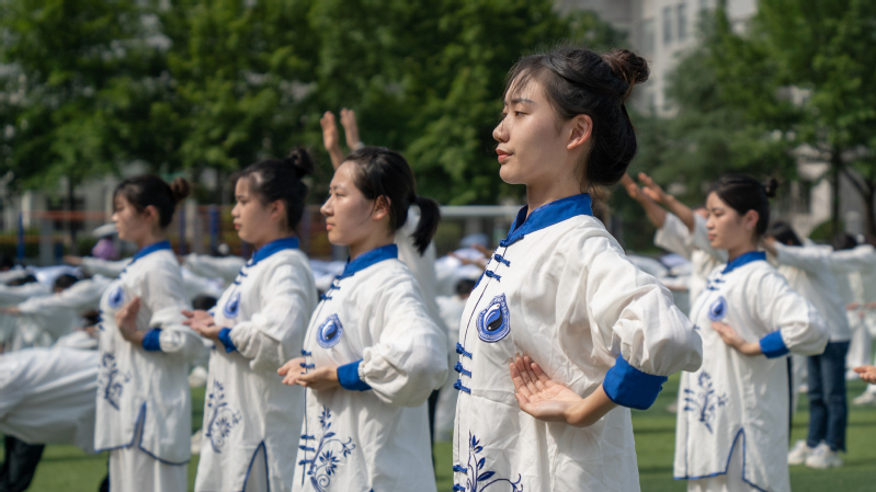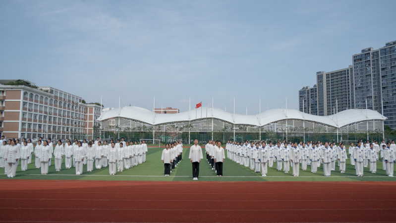 两手托天理三焦,左右开弓似射雕。6月8日下午,我校第45届运动会健身气功竞赛在西区田径场如期举行。共有10支学生代表队参加比赛,教职工代表队进行了展示。
