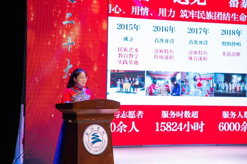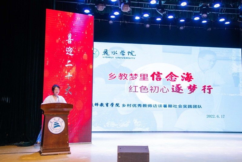 伴随着激昂的团歌,大会拉开帷幕。本次大学生暑期社会实践活动主题为“喜迎二十大 永远跟党走 奋进新征程”,围绕十项重点内容,组织开展六类社会实践专项。截止目前,我校共组建暑期社会实践团队344支,本次大学生暑期社会实践参与实践学生人数达3437人,共303名教师参与指导。“山哈歌起凤凰飞 畲汉携手党旗挥”——丽水学院“春蕾”社会实践团和“乡教梦里信念海,红色初心逐梦行”——乡村优秀教师访谈暑期社会实践队作为代表向在场观众展示了我校去年暑期社会实践优秀成果,随后,参与六大专项的学生代表上台宣誓。