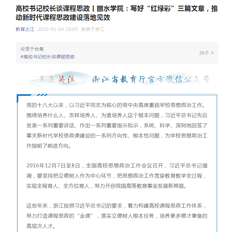 1月4日,浙江省教育厅微信公众号“教育之江”刊发我校党委书记王利琳署名文章《丽水学院:写好“红绿彩”三篇文章,推动新时代课程思政建设落地见效》。