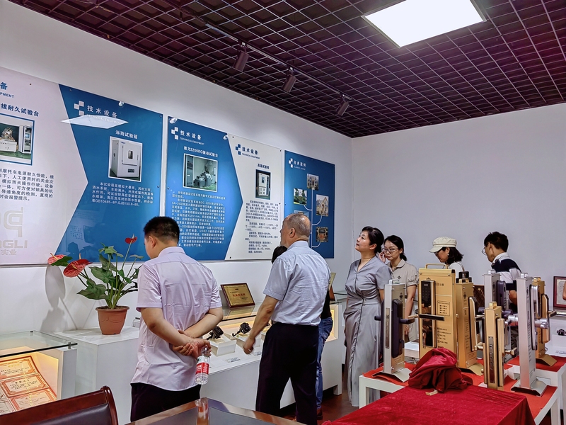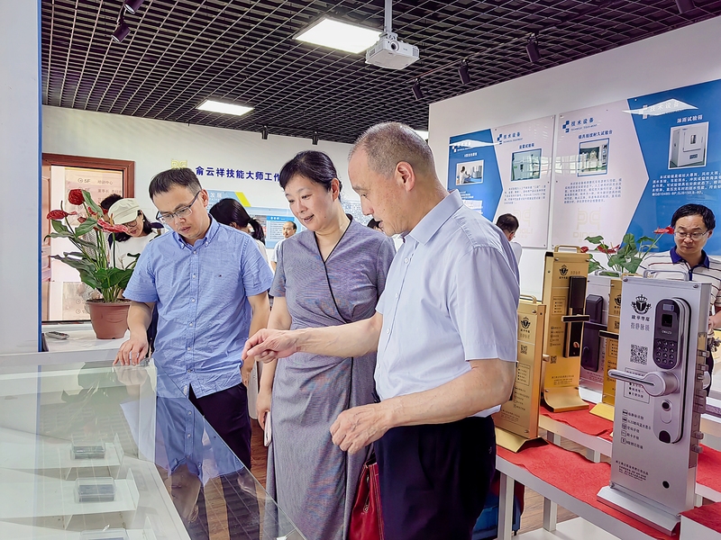 考察团第一站来到浙江鼎立实业有限公司。这是一家全国模范劳动关系和谐企业,主要从事点火开关、车用套锁、高端铸铝门及指静脉智能锁的研发、生产和销售。董事长俞云祥热情接待了大家并进行座谈交流。他向大家介绍了企业的发展历程、企业产品,分享了企业文化和未来规划,双方就人才培养与大学生实习见习、博士助力企业发展等达成初步意向。会后大家还参观了浙江省优秀技能大师工作室——俞云祥大师工作室。