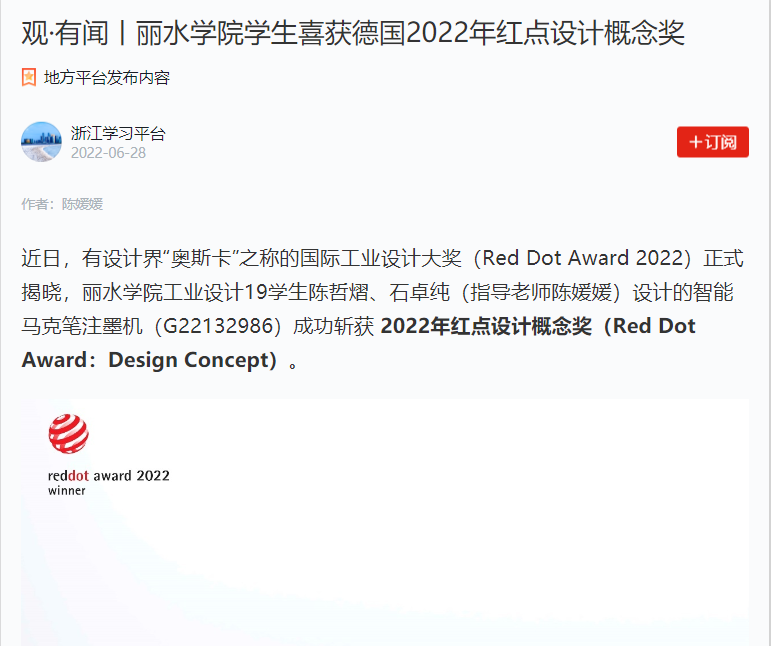 6月28日,学习强国浙江平台刊发了我校学生喜获德国2022年红点设计概念奖的消息。