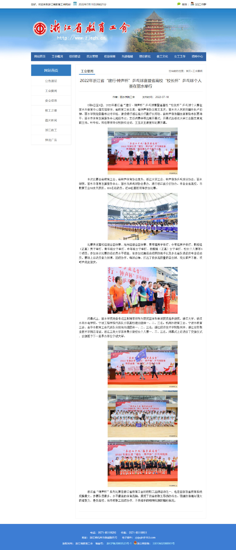7月10日,浙江省教育工会网站刊发了我校承办的2022年浙江省“建行·钟声杯”乒乓球赛暨省高校“校长杯”乒乓球个人赛举行的消息。