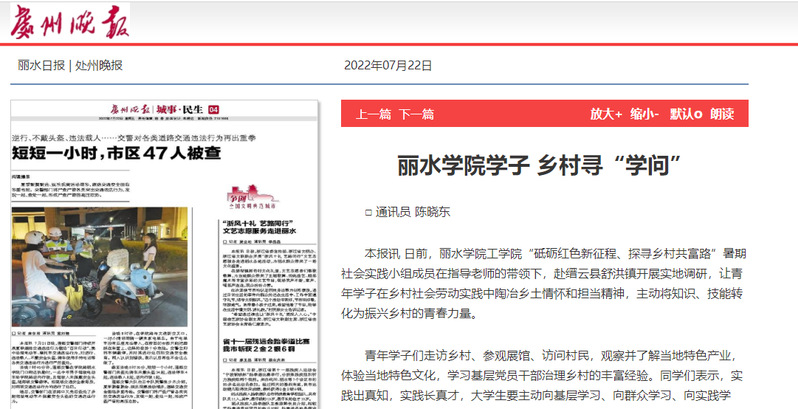 7月22日,处州晚报刊发了我校工学院“砥砺红色新征程、探寻乡村共富路”暑期社会实践小组成员在指导老师的带领下,赴缙云县舒洪镇开展实地调研的消息。