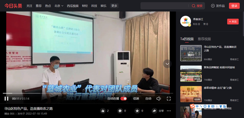 7月18日,青春浙江今日头条平台刊发了我校职业技术学院学子开展“寻山区特色产品,造直播助农之路”暑期实践的消息。