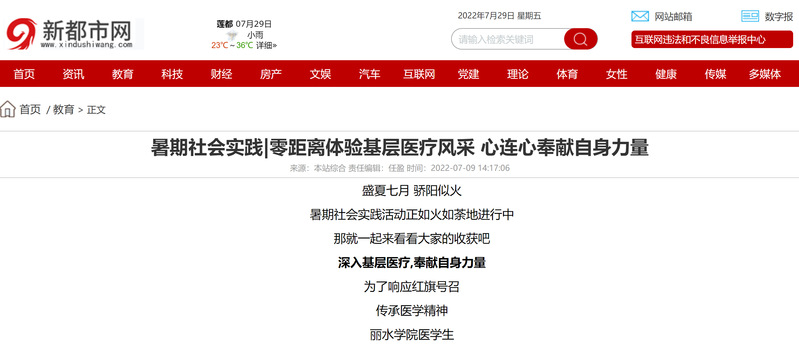 7月9日,中国城市网盟网站新都市网刊发我校医学院“零距离体验基层风采”暑期社会实践团队服务基层医疗的消息。