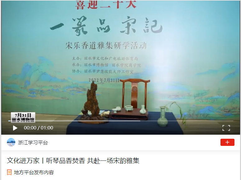 8月1日,学习强国浙江平台刊发了由丽水市文化和广电旅游体育局主办、丽水市博物馆和我校商学院承办的“一篆品宋记”宋乐香道雅集研学活动。