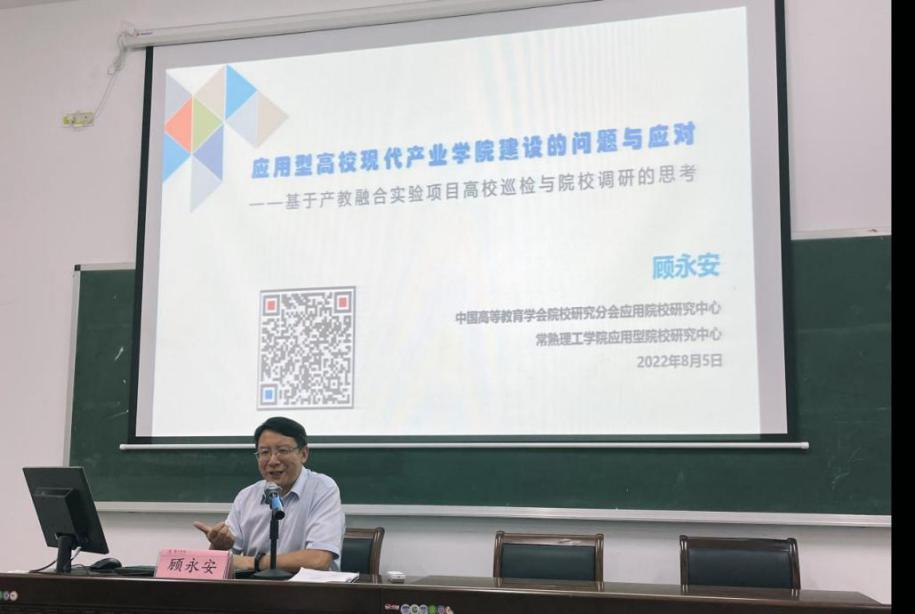 顾永安教授为作了题为《应用型高校现代产业学院建设的问题与应对》的报告,从五大方面阐述了产业学院建设的重要意义和原则、面临问题和应对措施、人才培养和课程建设、教师团队和企业和导师建设,以及针对产业的科研和社会服务等内容,提出了应用型人才培养的新模式,为我校产业学院建设和发展提供了宝贵的建议。