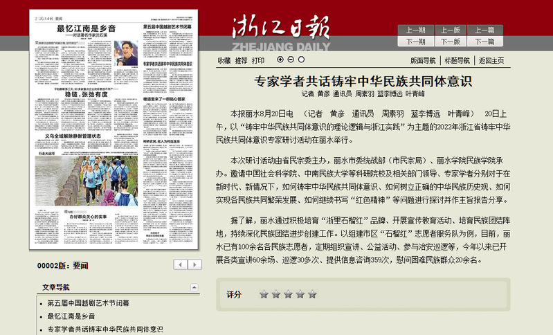 8月20日,浙江日报要闻版刊发了我校与省民宗委主办,丽水市委统战部(市民宗局)共同举办的“铸牢中华民族共同体意识的理论逻辑与浙江实践”专家研讨会的消息。