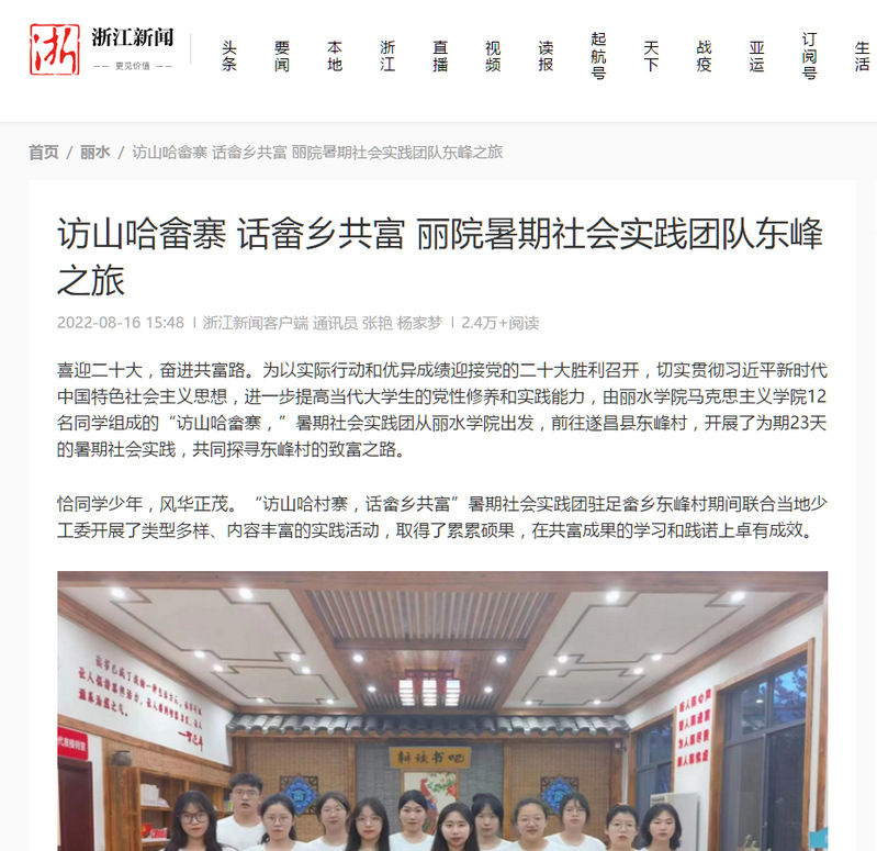 8月5号,浙江新闻平台刊发了我校马克思主义学院“访山哈畲寨,话畲乡共富”暑期社会实践团队前往遂昌县东峰村,开展了为期23天的暑期社会实践的消息。