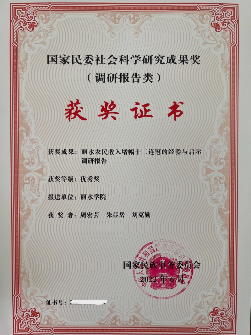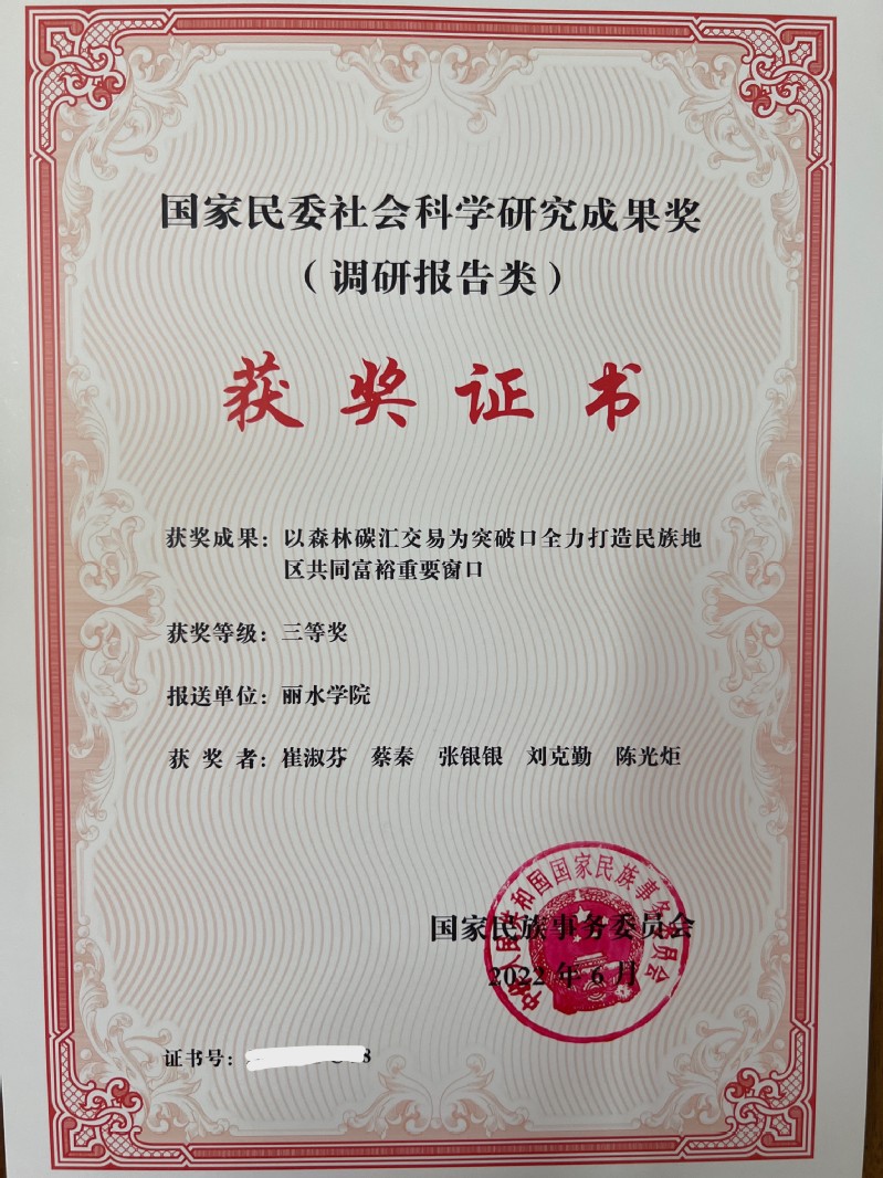 商学院崔淑芬教授团队的《以森林碳汇交易为突破口全力打造民族地区共同富裕重要窗口》获国家民委社会科学研究成果奖(调研报告类)三等奖。商学院周宏芸教师团队的《丽水农民收入增幅十二连冠的经验与启示调研报告》获国家民委社会科学研究成果奖(调研报告类)优秀奖。