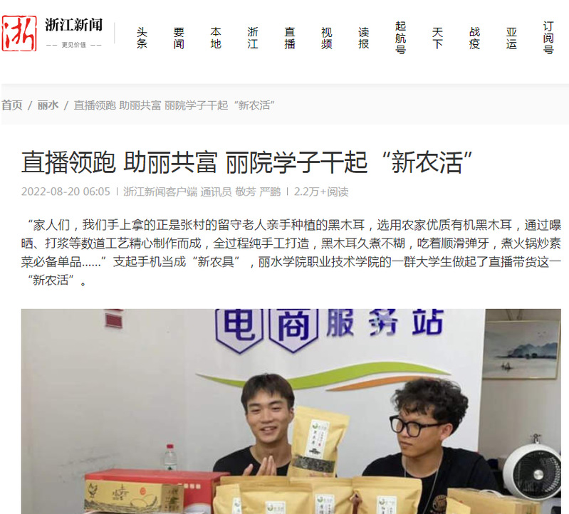 8月20日,浙江新闻客户端报道了我校职业技术学院学子开展农产品直播带货的暑期社会实践活动。