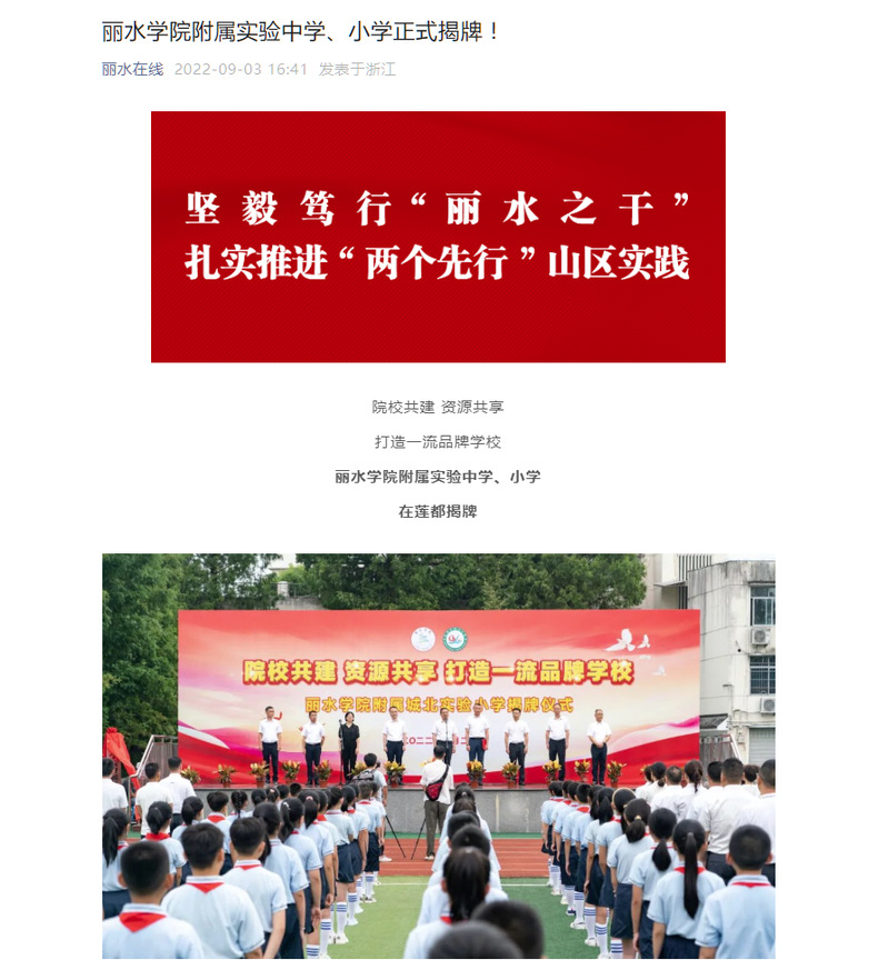 9月3日,丽水在线刊发了我校附属实验中学、小学正式揭牌的消息。