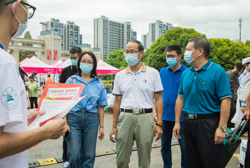 9月4日,浙江省教育发展中心五级职员陈龙春一行来我校检查指导迎新、学生资助工作,我校党委副书记叶华松陪同检查。
