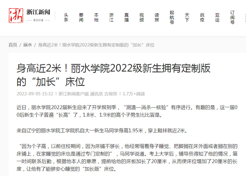9月5日,浙江新闻客户端刊发了我校新生身高近2米,拥有定制版的“加长”床位的消息。