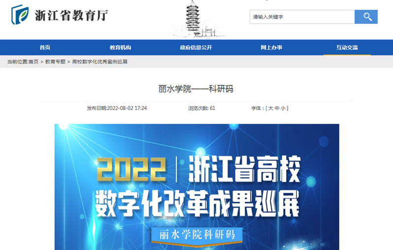 日前,浙江省教育厅官方网站公布了2022浙江省高校数字化改革成果巡展作品,我校科研与地方合作处主导开发的“科研码”成功入选。这生动展示了我校在数字化改革中取得的积极进展与成效。