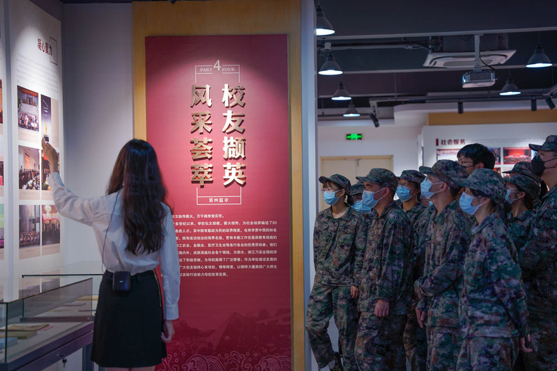 校史馆展厅共分《栉风沐雨 兴学育才》《革故鼎新 融合发展》《明德笃行 勇创一流》《校友撷英 风采荟萃》《枝叶关情 勇谱新篇》五个篇章。在“括山苍苍,瓯水泱泱”的校歌声中,新生在工作人员的带领下有序进场。讲解员从学校的创始人孙诒让讲起,将我校的百年历史娓娓道来,除了讲历史文化,讲解员们还从校园文化、社会服务、国际交流、基础建设以及校友风采多方面展示了学校这些年来的光辉历程,并与新生一起展望学校美好未来。
