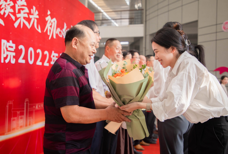 最后,新入职教师代表向荣休教师献花以表敬意。