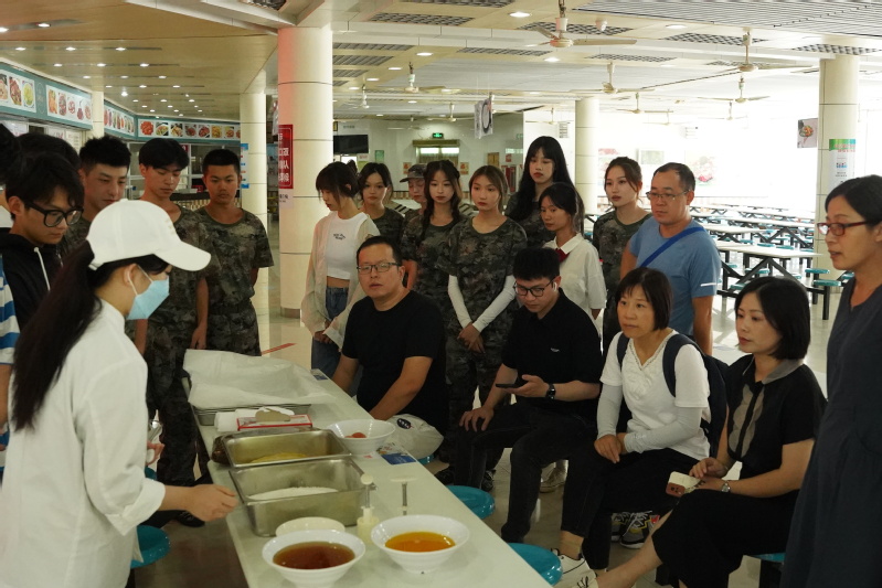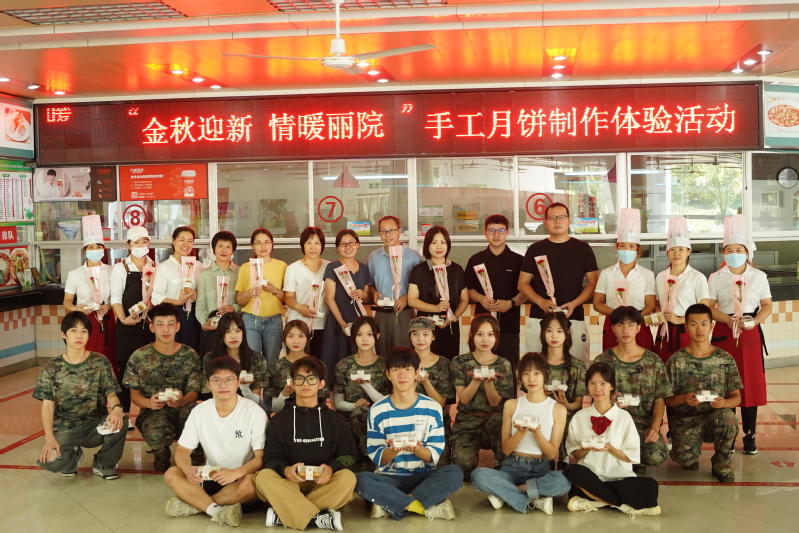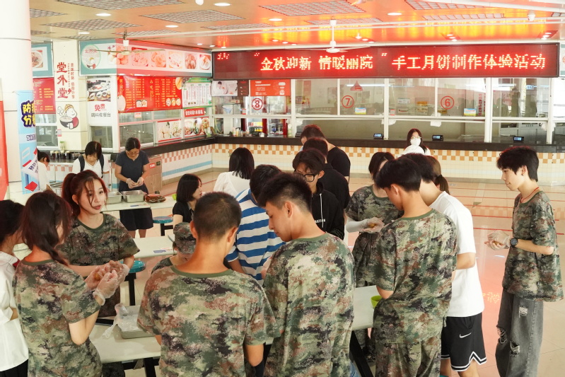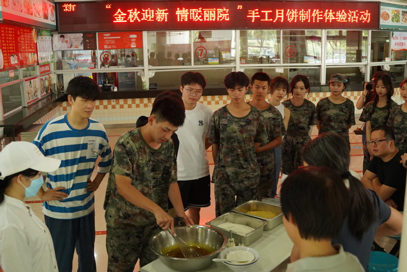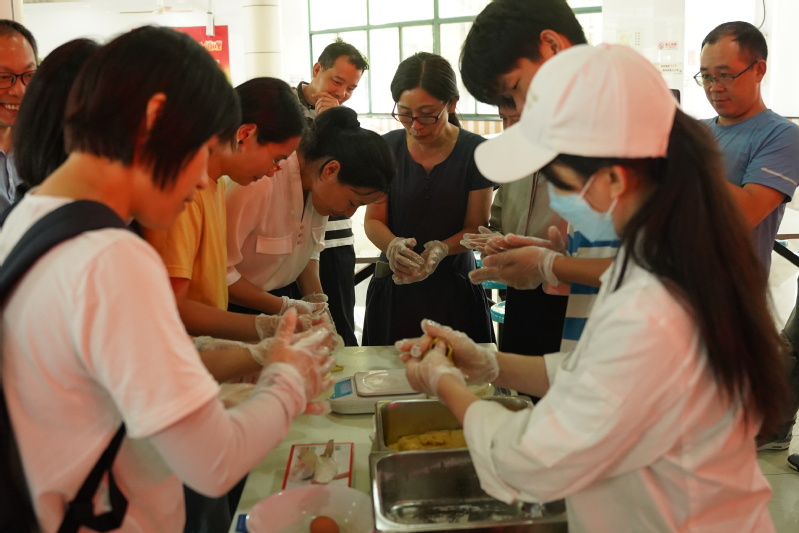 餐饮中心面点师傅一边讲解广式月饼的做法,一边熟练地现场示范揉面团、压皮、包馅、盖章,一个个饱满诱人的广式月饼随之呈现,引得师生们跃跃欲试。师生齐心协力,有序分工,忙得不亦乐乎,也感受到了制作的乐趣和满满的幸福。不少师生还进到后厨参与烹饪,吃到了自己制作的月饼,在丽院这个大家庭感受到家的温暖。
