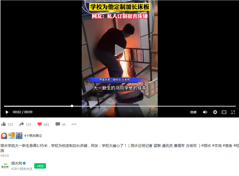 9月5日,丽水网视频号刊发我校为身高1.95米的新生,定制加长床铺的消息。