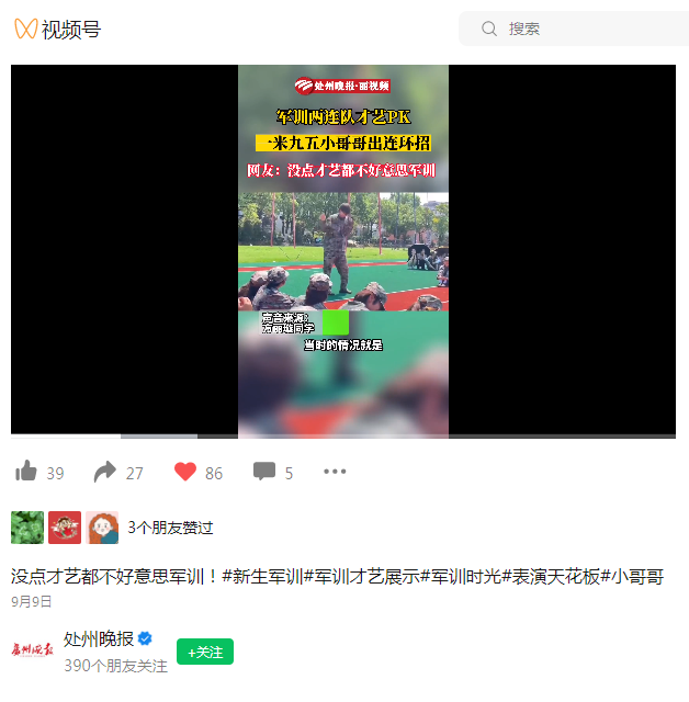 9月9日,处州晚报视频号刊发了我校学生军训才艺展示的内容。