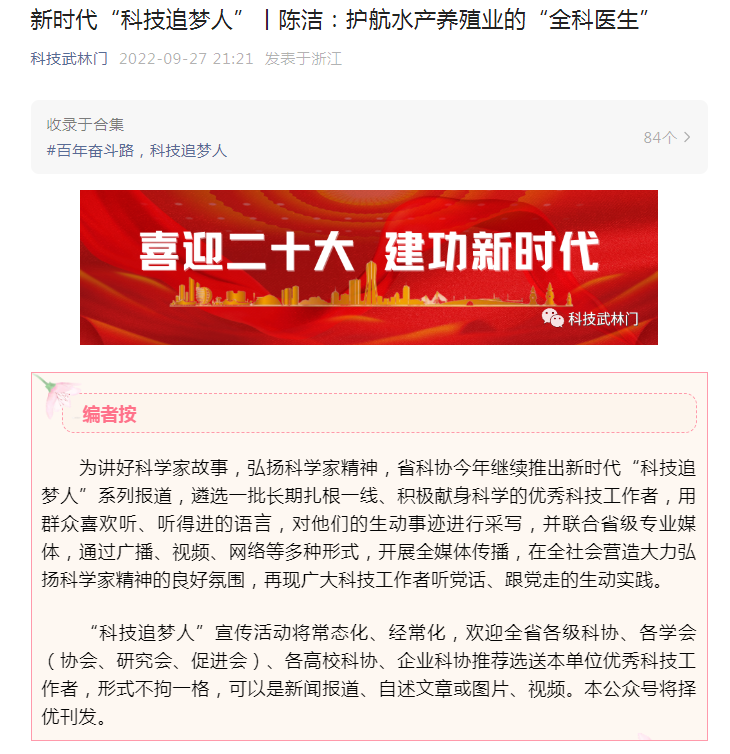 9月27日,浙江省科学技术协会公众号“科技武林门”刊发了我校生态学院陈洁博士护航水产养殖的先进事迹。