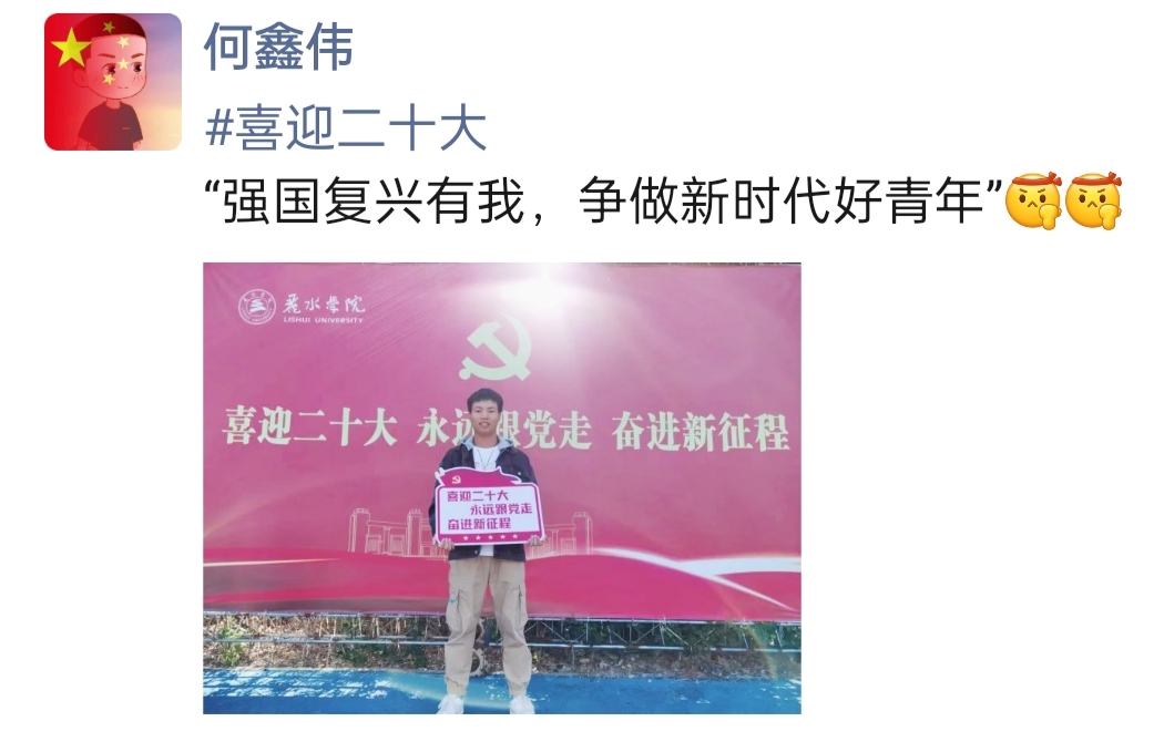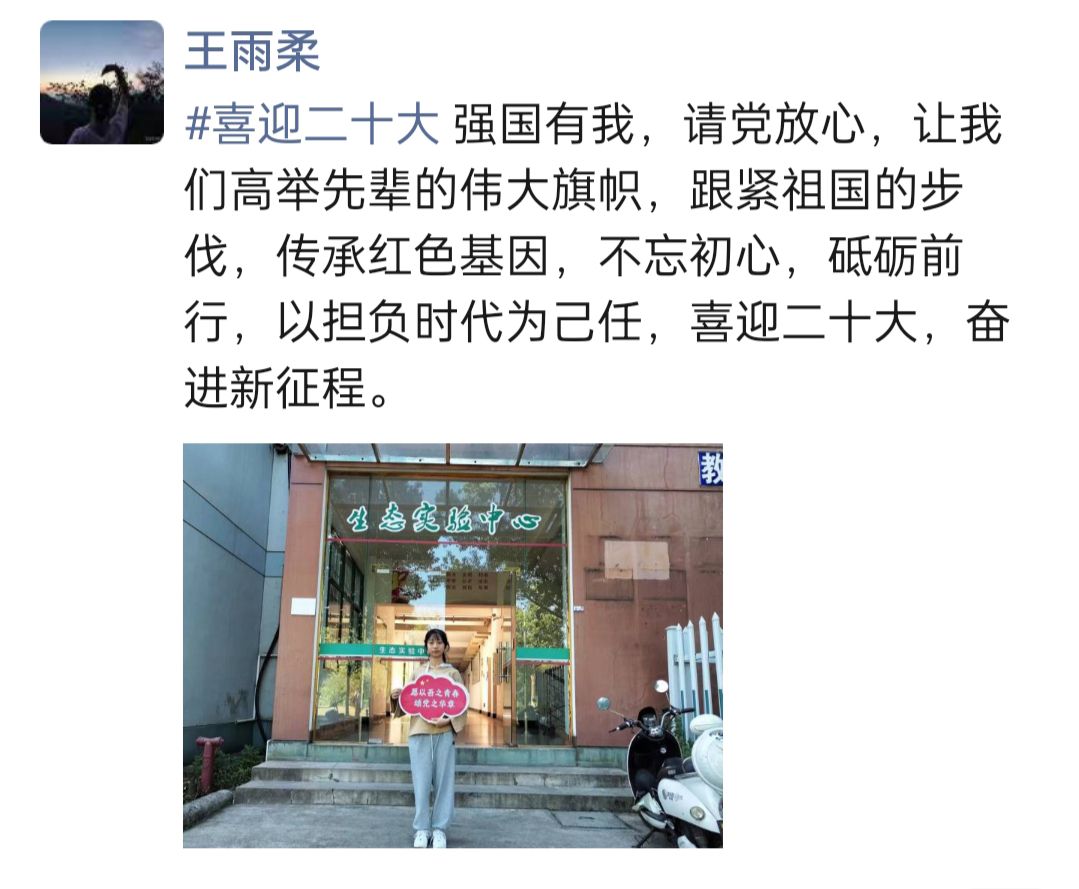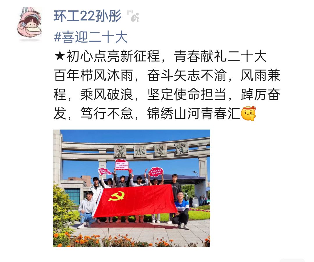 校门口前、牡丹亭下、生态实验中心……青年学子手持“喜迎二十大,青年赤子心,砥砺复兴志”“愿以吾之青春,颂党之华章”“你的1921,我的2022,祖国永远繁荣昌盛”等标语出现在校园各个角落,以元气满满的形象奏响“礼赞新时代,奋进新征程的青春主旋律。在本次活动中,同学们的朋友圈早已被这些“校园打卡”的照片“刷屏”,不仅融入了生态特色,而且句句是传颂的赞语,处处是红色的传承,大家用一幅幅生动的画面描绘了新时代的青春赞歌。