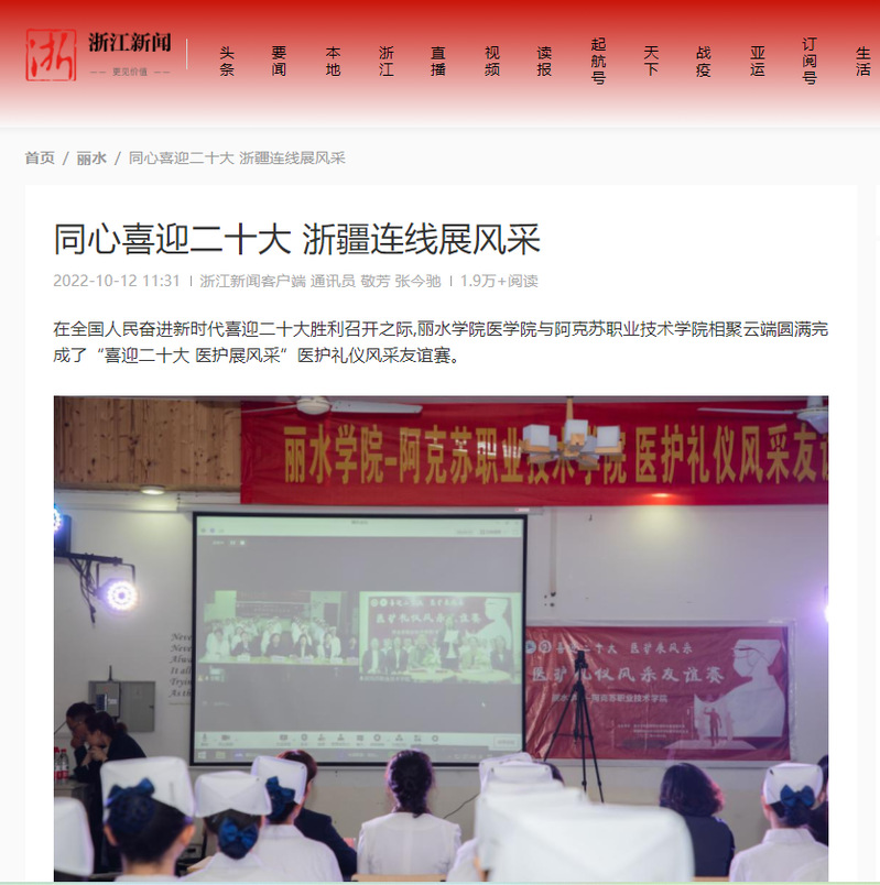 10月12日,浙江新闻客户端发布了我校医学院与阿克苏职业技术学院通过同步连线相聚云端开展“喜迎二十大 医护展风采”医护礼仪风采友谊赛的报道。