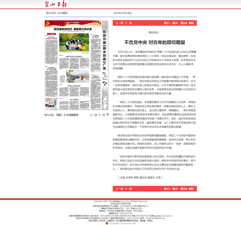 10月18日,丽水日报刊发了我校马克思主义学院青年教师周之新和学生团委副书记李昊昕热议党的二十大报告的消息。