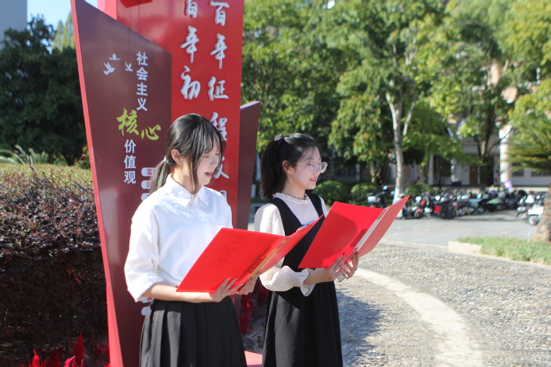经过前期遴选、朗读排练等充分筹备,活动当天“清廉朗读者”分组前往红色教育广场、陶行知像、图书馆前、牡丹亭等地点进行朗读。在红色教育广场读《总司令的两封信》,感受朱德前辈对青年人的谆谆教诲;在陶行知像前读《廉耻论》,体会欧阳修“四维不张、国乃灭亡”的大义;在牡丹亭咏“出淤泥而不染,濯清涟而不妖”。最后共同前往操场集体朗读,感受并交流古今廉洁之风。