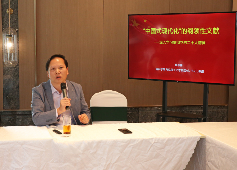 我校马克思主义学院院长、直属党支部书记龚志伟作《“中国式现代化”的纲领文献——深入学习贯彻党的二十大精神》专题辅导报告。龚志伟围绕“坚持党的领导”和“全面实现中国式现代化”等关键词,从中国共产党领导下现代化国家建构的探索、深刻认识中国式现代化的本质要求与中国特色、全面领悟中国式现代化的创造性、学习贯彻党的二十大精神的“五个牢牢把握”等四个方面为大家重点解读了党的二十大报告精神。