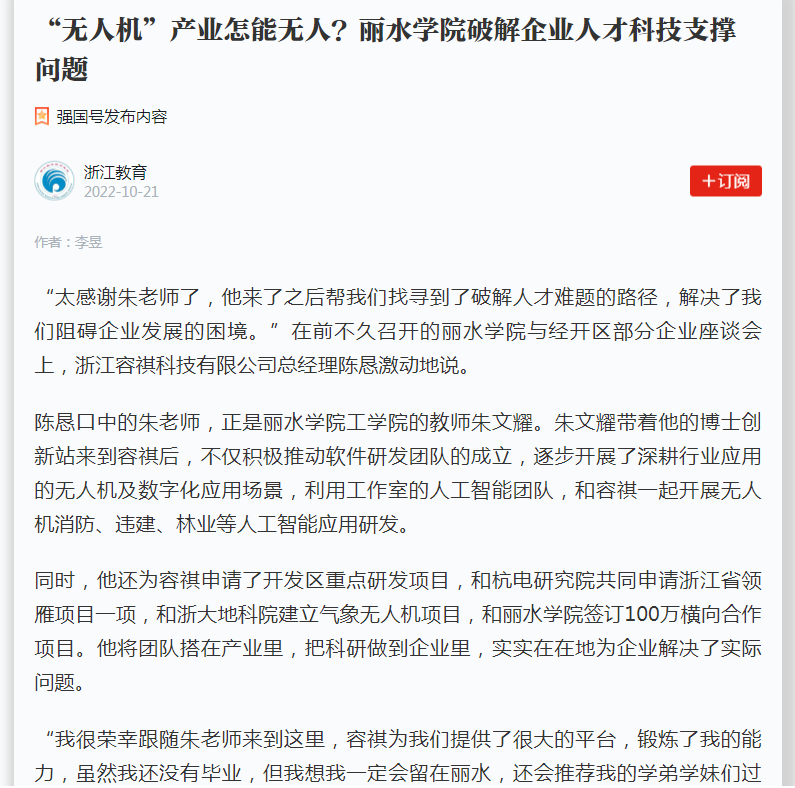 10月21日,浙江教育报学习强国号刊发了我校破解“无人机”企业人才科技支撑问题的消息。