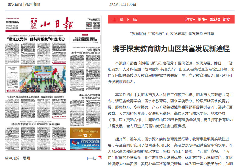 11月5日,丽水日报刊发了我校举办“教育赋能 共富先行”山区26县高质量发展论坛,携手探索教育助力山区共富发展新途径的消息。