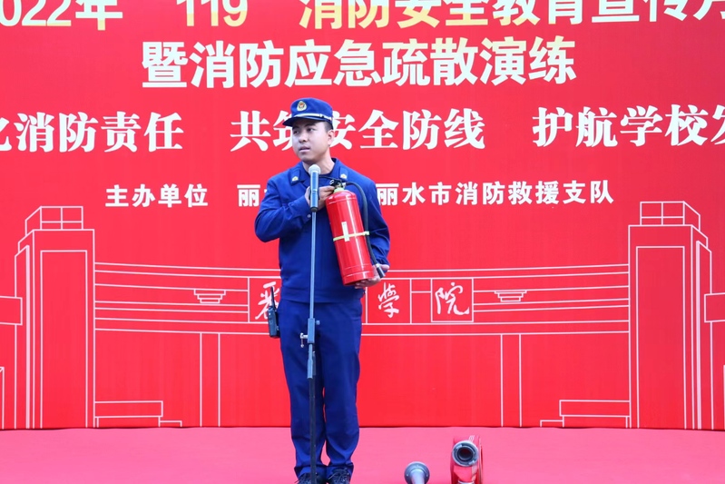 为进一步提高师生消防安全意识,11月9日全国消防日,我校在图书馆开展以“强化消防责任,共筑安全防线,护航学校发展”为主题的消防安全教育宣传月启动仪式暨消防应急疏散演练。校党委副书记叶华松,丽水市消防救援支队副支队长王峥宇等出席启动仪式。
