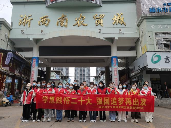 为进一步学习和宣传党的二十大精神,日前,马克思主义学院组织志愿者赴浙西南农贸城开展党的二十大精神宣传活动。