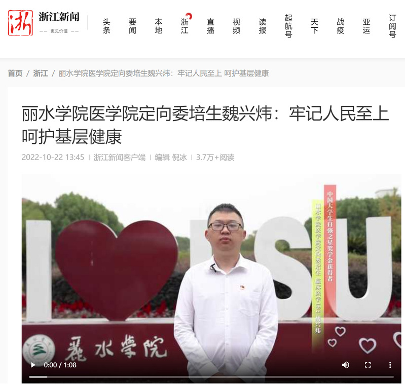 10月22日,浙江新闻客户端报道了我校医学院定向委培生魏兴炜的先进事迹。