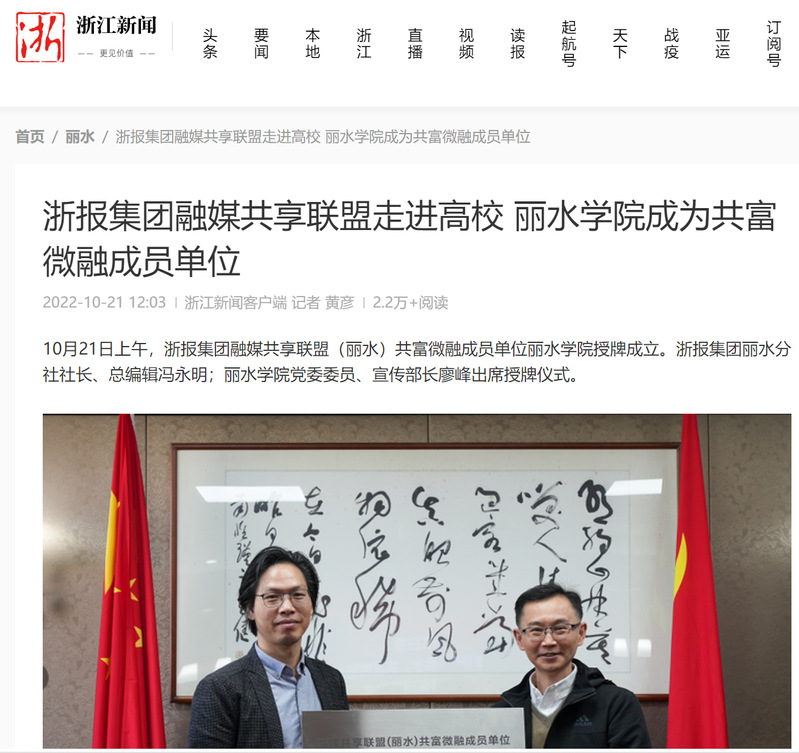 10月21日,浙江新闻客户端报道了浙报集团融媒共享联盟(丽水)共富微融成员单位丽水学院授牌成立的消息。