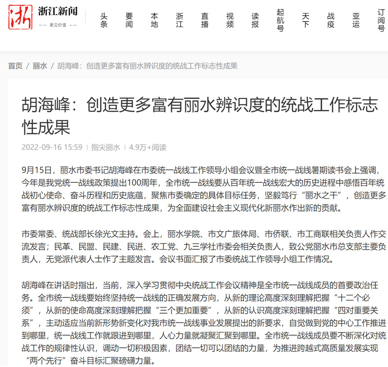 9月16日,浙江新闻客户端报道了丽水市委书记胡海峰在市委统一战线工作领导小组会议暨全市统一战线暑期读书会上报告中提到丽水学院成为硕士学位授予单位的消息。