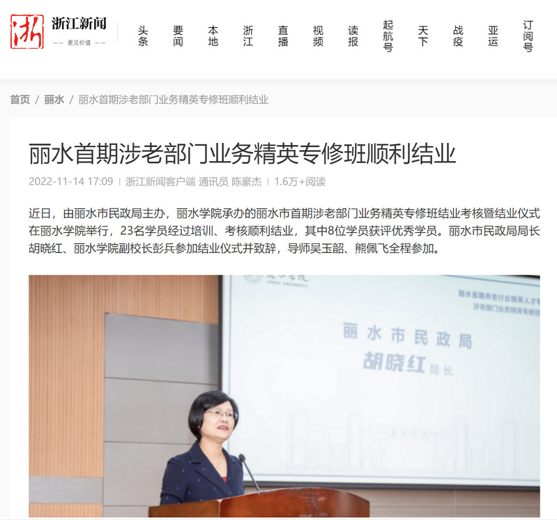 11月14日,浙江新闻客户端报道了由我校承办的丽水市首期涉老部门业务精英专修班顺利结业的消息。