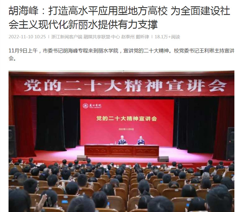 11月10日,浙江新闻客户端刊发了市委书记胡海峰来我校宣讲党的二十大会议精神的消息。